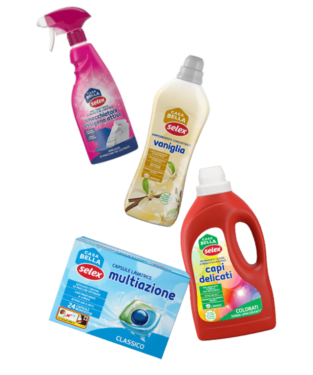 Nella linea Casa Bella Selex puoi trovare tutto ciò che ti occorre per i tuoi panni, differenziato in base alle diverse esigenze di lavaggio. Ci sono i detersivi liquidi e quelli in comode capsule, ma anche gli smacchiatori spray, per eliminare lo sporco più ostinato. Gli ammorbidenti Casa Bella, con i loro profumi, ti accompagneranno, avvolgendoti in un delicato abbraccio. Che dire poi dei prodotti capaci di prendersi cura dei tuoi capi delicati?