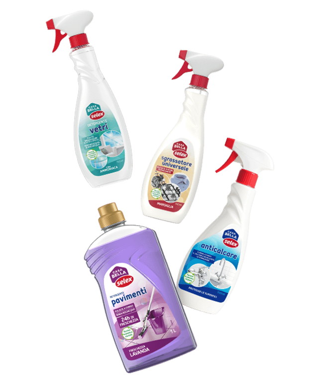 L’offerta di Selex per avere una casa bella, nella quale sentirsi a proprio agio, immersi in un piacevole profumo di pulito, è vasta e completa: dai detergenti per differenti tipologie di pavimento che al loro passaggio liberano diverse e profumate essenze agli sgrassatori per una cucina a prova di chef, dal detergente vetri per una trasparenza senza aloni ai prodotti anticalcare per rubinetterie splendenti, in bagno come in cucina.