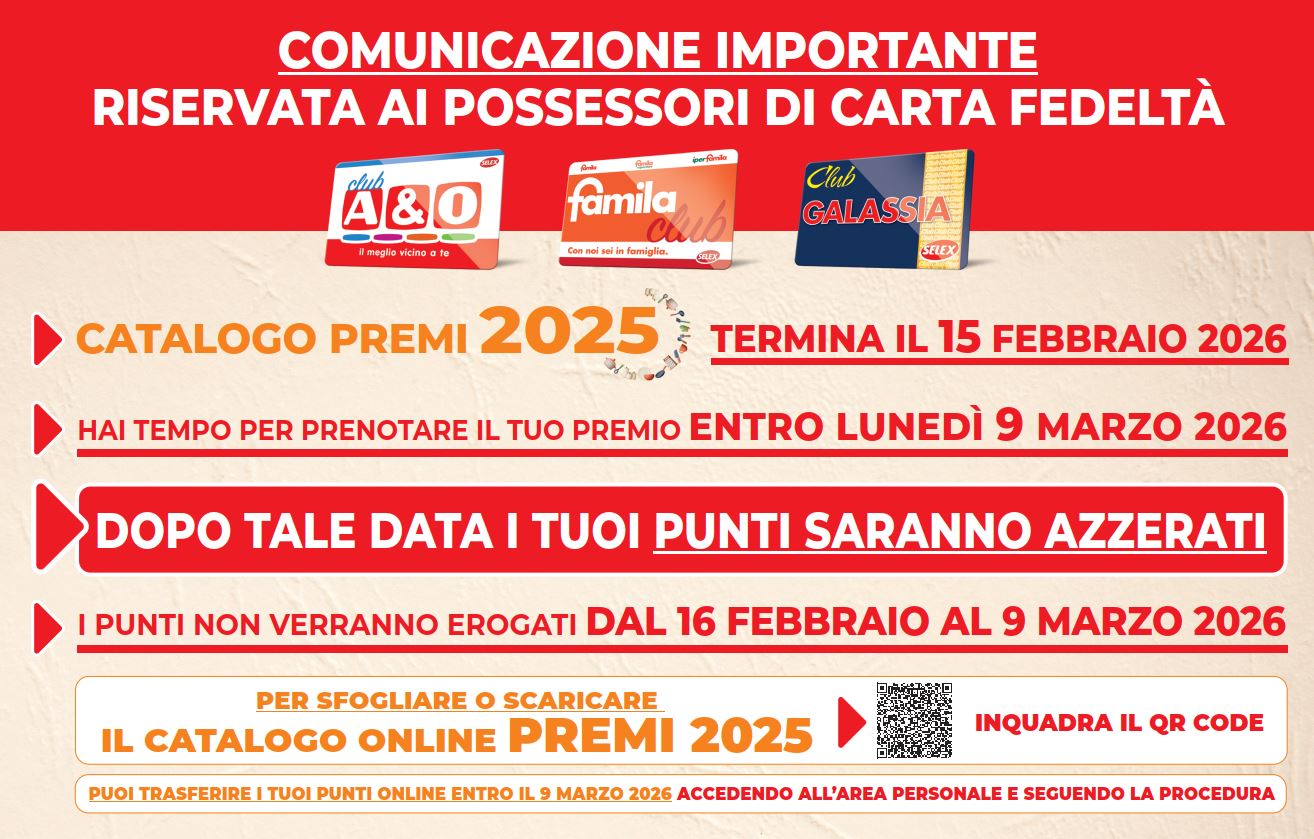 Il Catalogo Premi termina il 15/2. Puoi richiedere i tuoi premi entro il 9/3, dopo tale data i punti verranno AZZERATI. Dal 16/2 al 9/3 non saranno erogati punti.