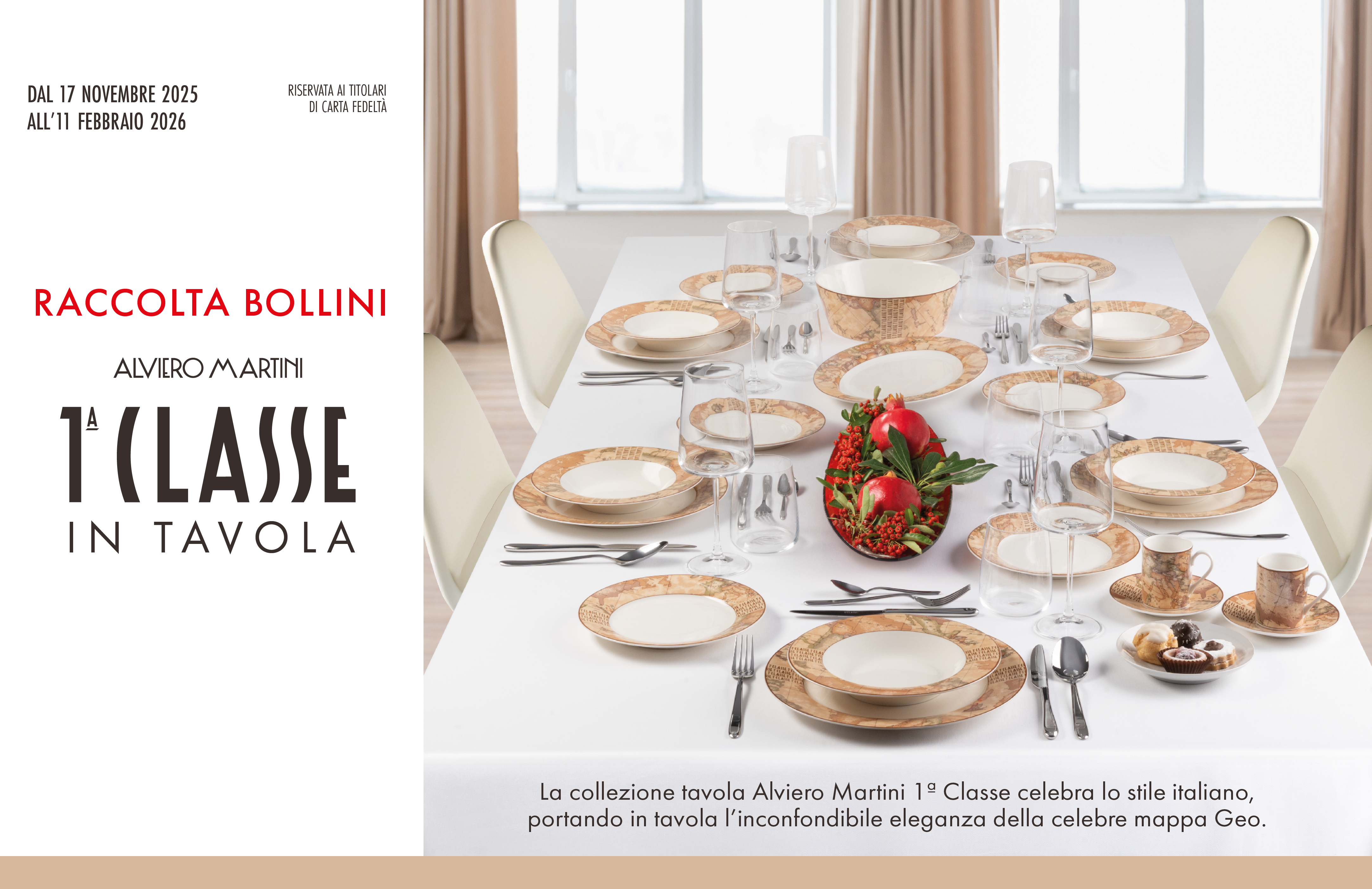 La collezione tavola Alviero Martini 1a Classe celebra lo stile italiano, portando in tavola l'inconfondibile eleganza della celebre mappa Geo.